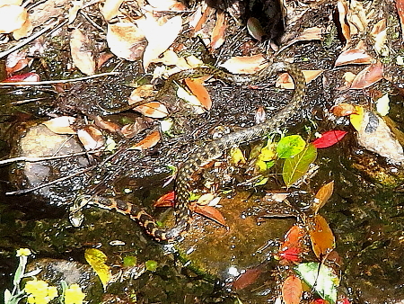 ヤマカガシ 頭部は左下、狙っているのは浅場のオタマジャクシ 眺めていると、オタマジャクシを何度も捕食した |
