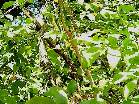 | アオダイショウ 頭部は左上、立ち木に絡んで狙っているのは鳥の巣であろうか |