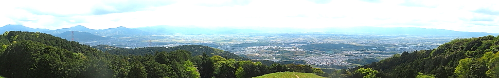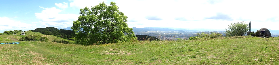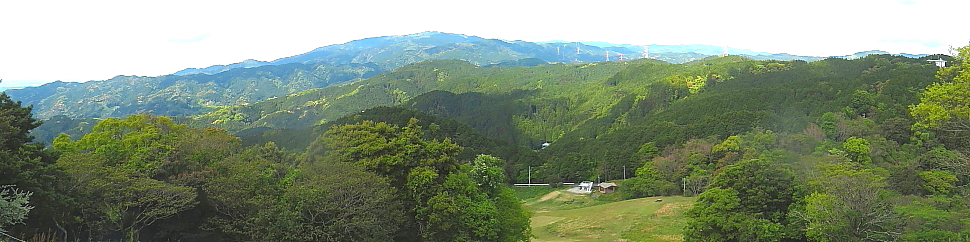 基山山頂からの眺め 下は草スキー場 中央奥は九千部山 右奥は脊振山 |