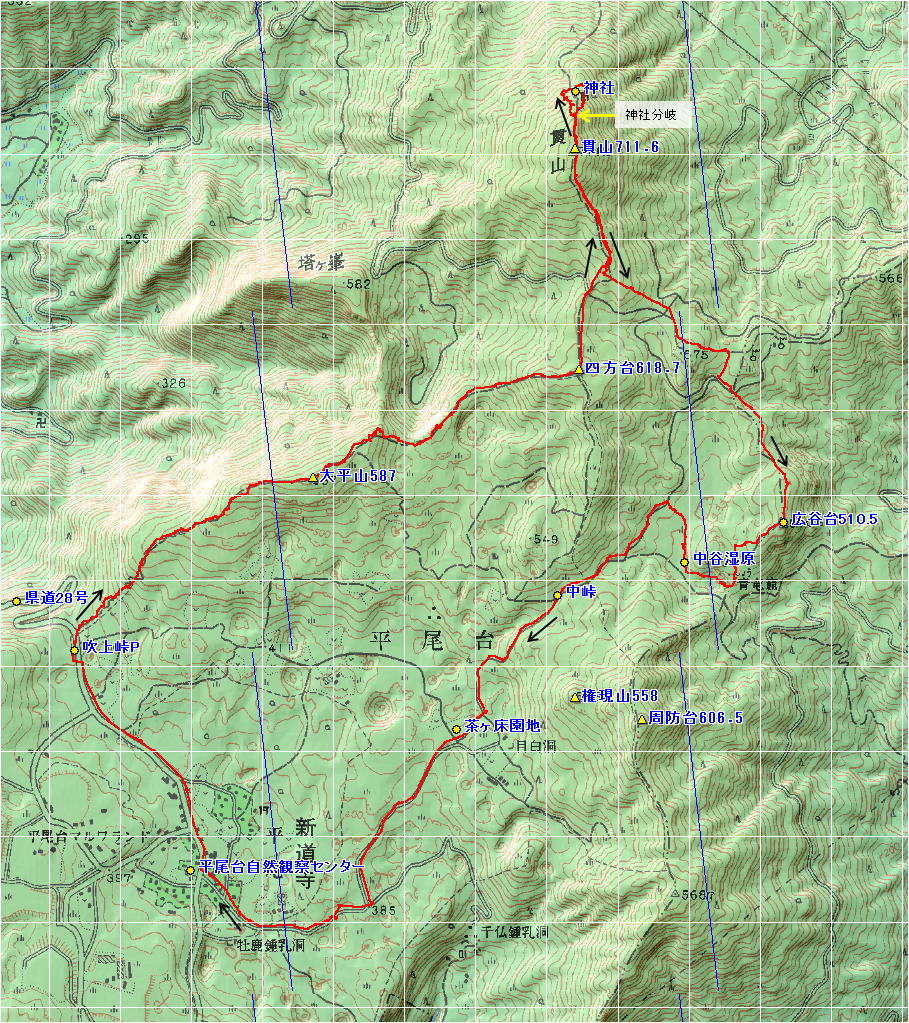経路概念図 GPS軌跡 1/25000地形図 緯線の間隔10秒、距離約310m 経線の間隔10秒、距離約250m
