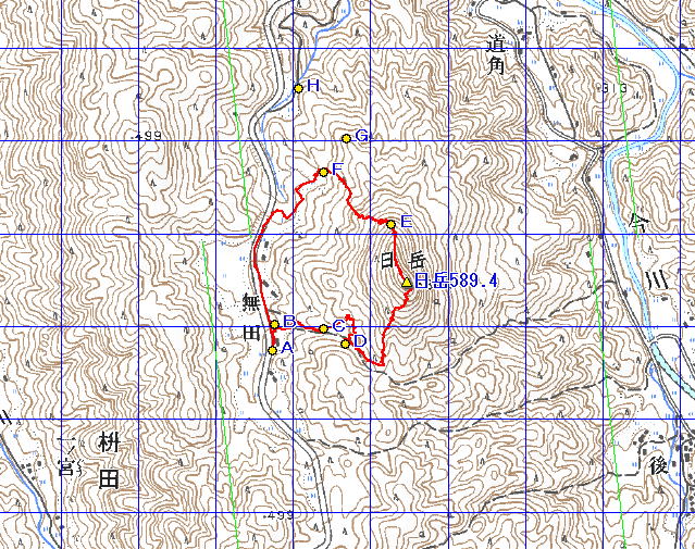注2:Eでルートを間違えたようである。正しくはE〜G〜Hへ尾根を下るのであろうと推測。
