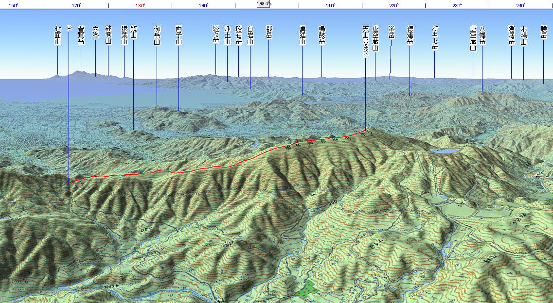 経路断面概念図 GPSデータ+10mメッシュ標高データ 断面の沿面距離約7.7km 所要時間3:30