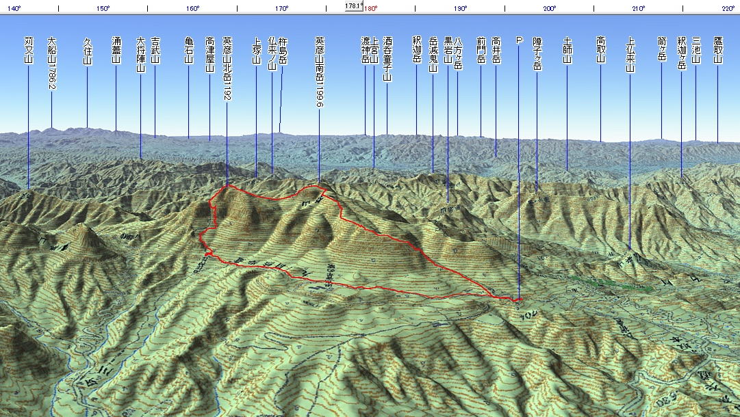 3D 設定:対地高度1200m レンズ16mm (180°は南)+日本山名データ25000 |