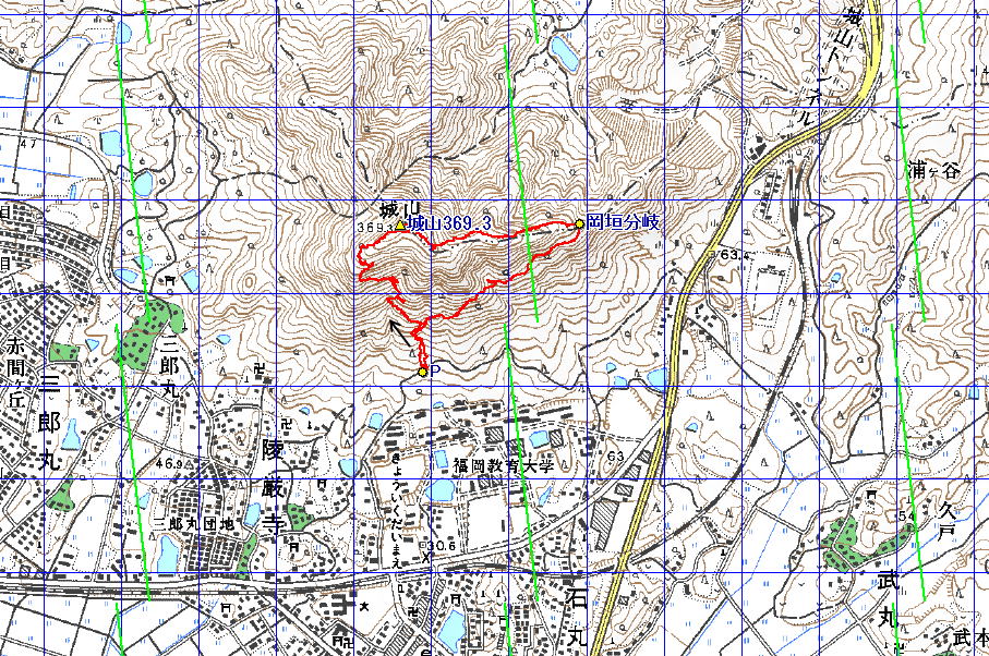 | 城山 (福岡県 13.08.07) 経路概念図 GPS軌跡 1/25000地形図 緯線の間隔10秒、距離約310m 経線の間隔10秒、距離約250m |
