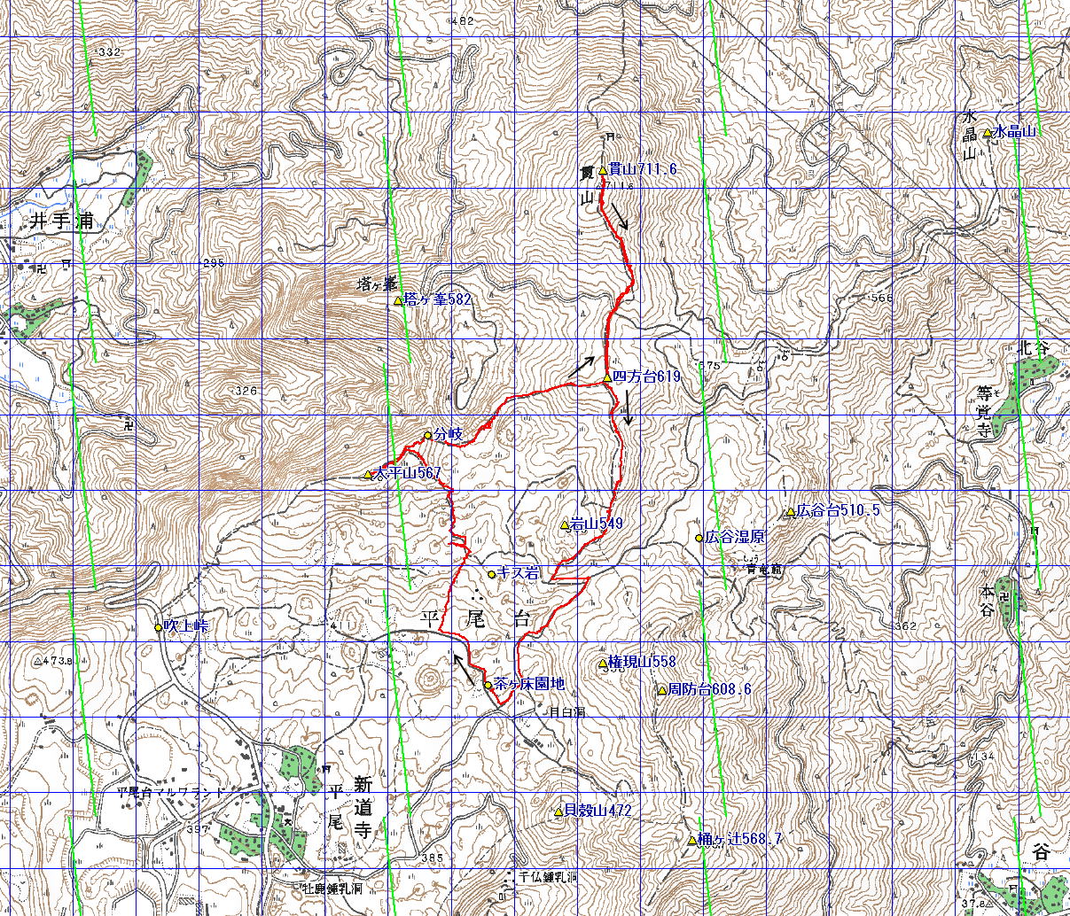 | 大平山 貫山 (13.10.14) 経路概念図 GPS軌跡 1/25000地形図 緯線の間隔10秒、距離約310m 経線の間隔10秒、距離約250m |