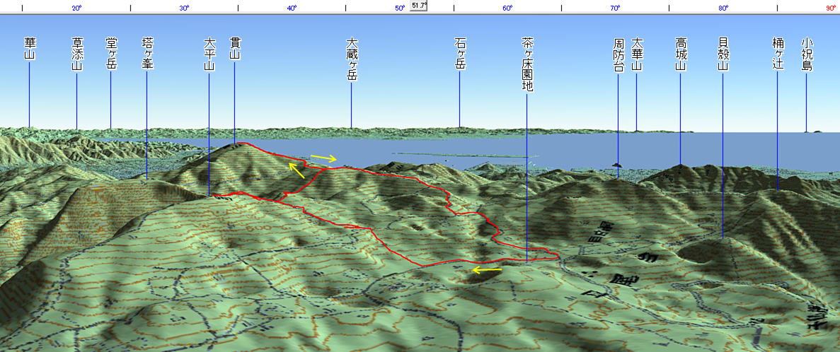 3D 設定:対地高度400m レンズ16mm 図上段の数値は方位角(真北0°〜360°)+日本山名データ25000+追加地名 |