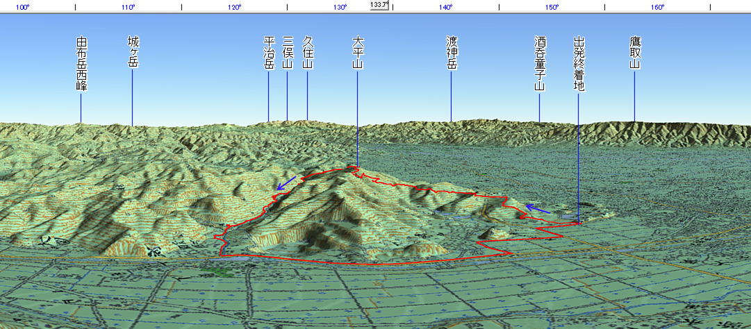 3D 設定:対地高度350m レンズ16mm 図上段の数値は方位角(真北0°〜360°)+日本山名データ25000+追加地名