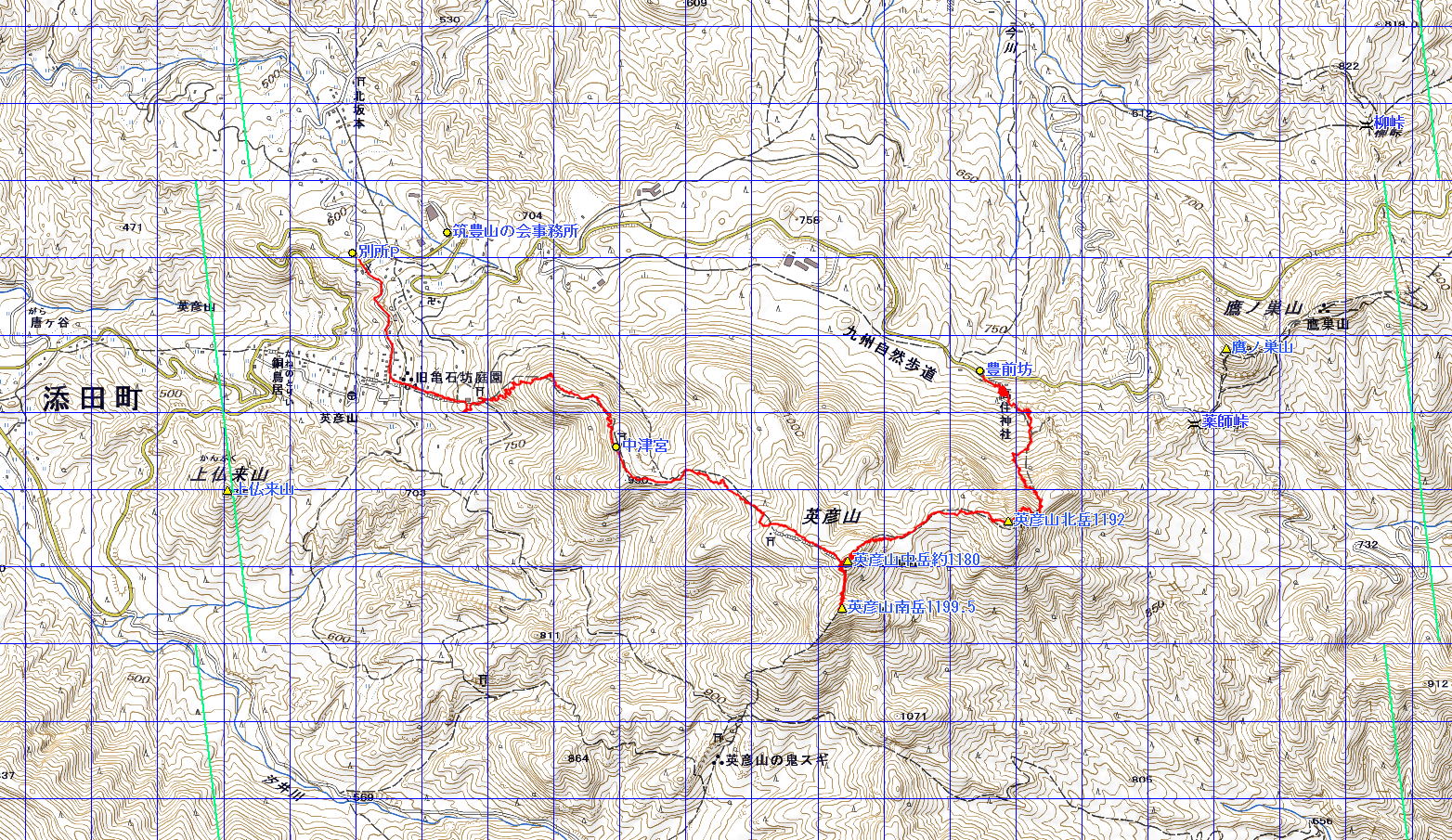 英彦山 (福岡県 14・06・14) 経路概念図 GPS軌跡 1/25000地形図 緯線の間隔10秒、距離約310m 経線の間隔10秒、距離約250m