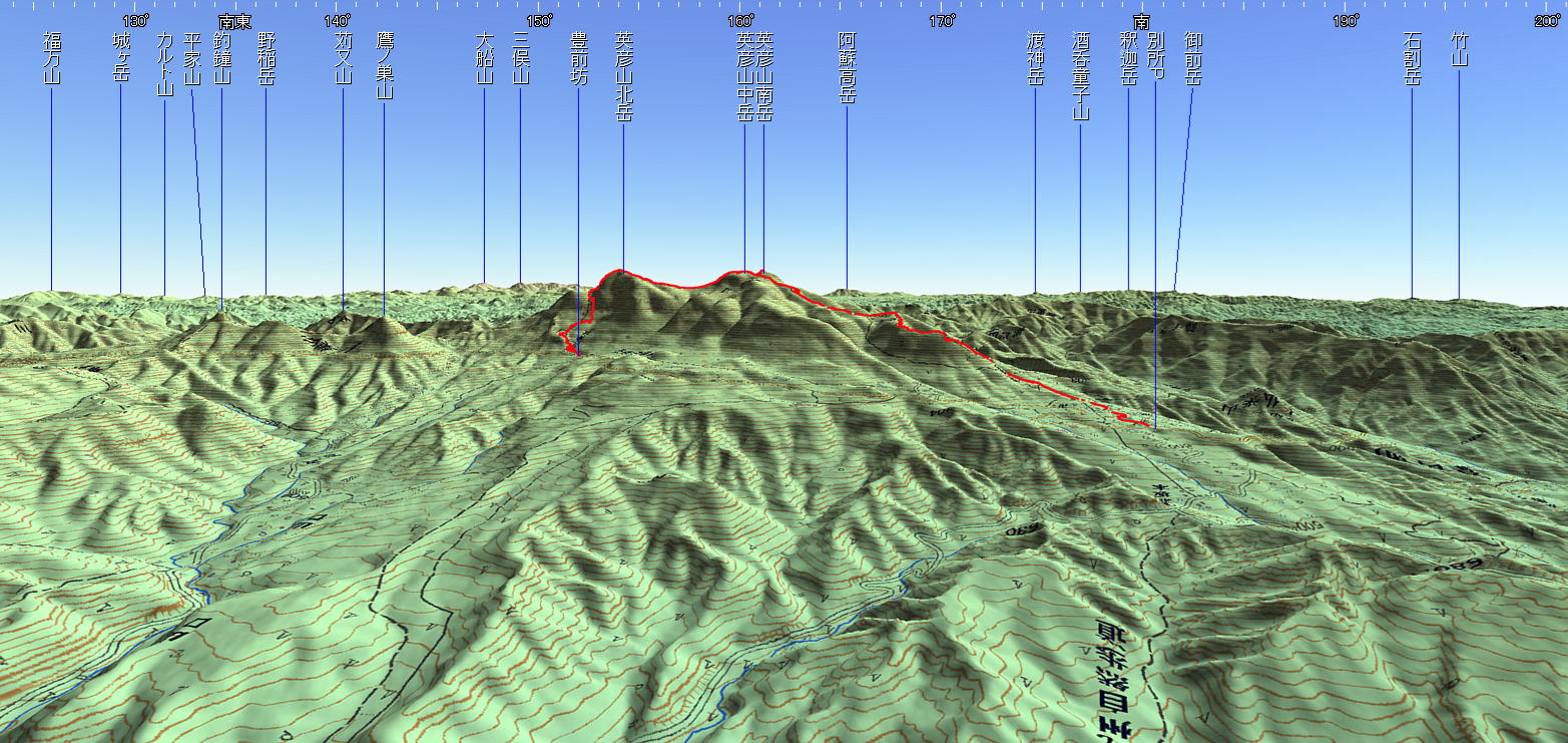 3D 設定:対地高度730m レンズ16mm 図上段の数値は方位角(真北0°~360°)+日本山名データ25000+追加地名 経路断面概念図 GPSデータ+10mメッシュ標高データ 断面の沿面距離約6.9km 所要時間4:00(うち、打合せや山頂のトイレ清掃など0:40)