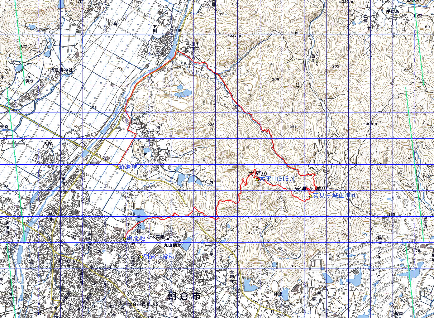 安見ヶ城山 大平山 (福岡県 14・09・10) 経路概念図 GPS軌跡 1/25000地形図 緯線の間隔10秒、距離約310m 経線の間隔10秒、距離約250m