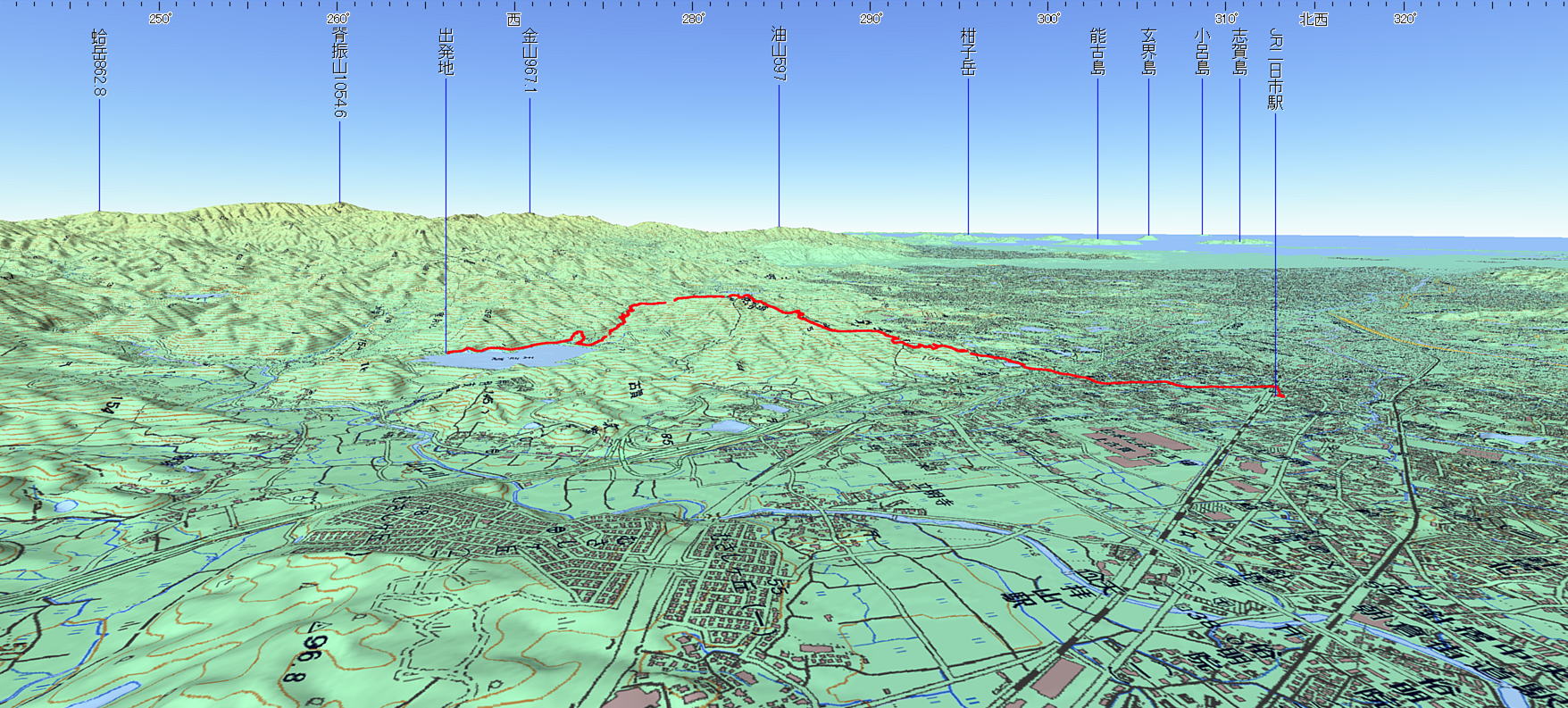 3D 設定:対地高度620m レンズ16mm 日本山名データ25000+追加地名 経路断面概念図 GPSデータ+10mメッシュ標高データ 断面の沿面距離約7.5km 所要時間3:35