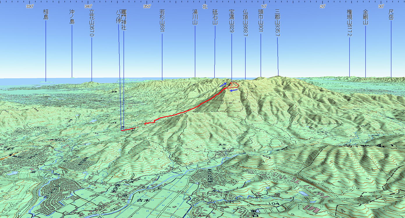 宝満山 (福岡県 16.2.05) 経路概念図 GPS軌跡 1/25000地形図 緯線の間隔10秒、距離約310m 経線の間隔10秒、距離約250m 緑の線は磁北線 注:出発地は竈門神社、終着地は内山バス停 3D 設定:対地高度820m レンズ16mm 日本山名データ25000+追加地名 経路断面概念図 GPSデータ+10mメッシュ標高データ 断面の沿面距離約7.0km 所要時間3:55