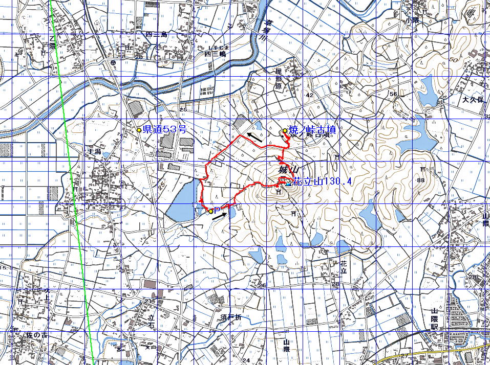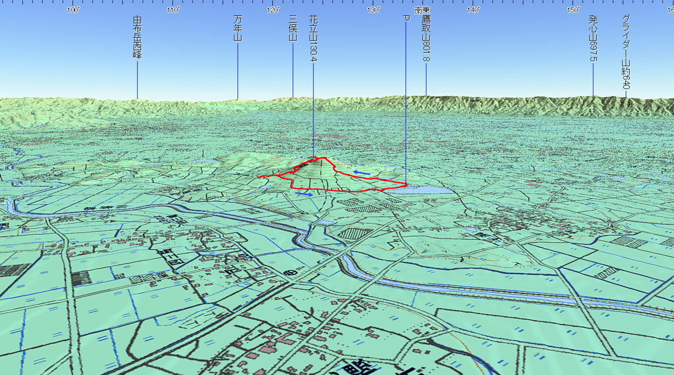 花立山 (福岡県 16.04.24) 経路概念図 GPS軌跡 1/25000地形図 緯線の間隔10秒、距離約310m 経線の間隔10秒、距離約250m 緑の線は磁北線 3D 設定:対地高度430m レンズ16mm 日本山名データ25000+追加地名 経路断面概念図 GPSデータ+10mメッシュ標高データ 断面の沿面距離約3.2km 所要時間1:45