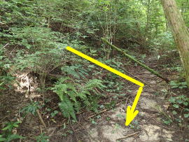 ⑥ ![]() 作業道出会い この地点は、逆方向の登り ではやや分かりづらい 目印は、テープと奥の斜め横木 |