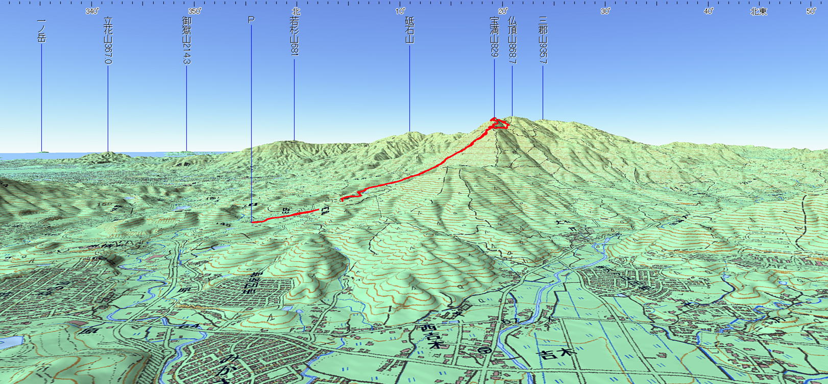 3D 設定:対地高度520m レンズ16mm 日本山名データ25000+追加地名 経路断面概念図 GPSデータ+10mメッシュ標高データ 断面の沿面距離約7.7km 所要時間4:50(昼食を含む)