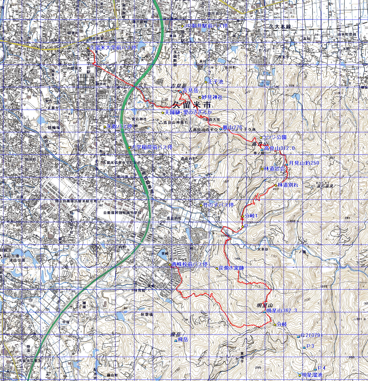注:出発終着地は久留米大学前バス停、終着地は青峰校前バス停