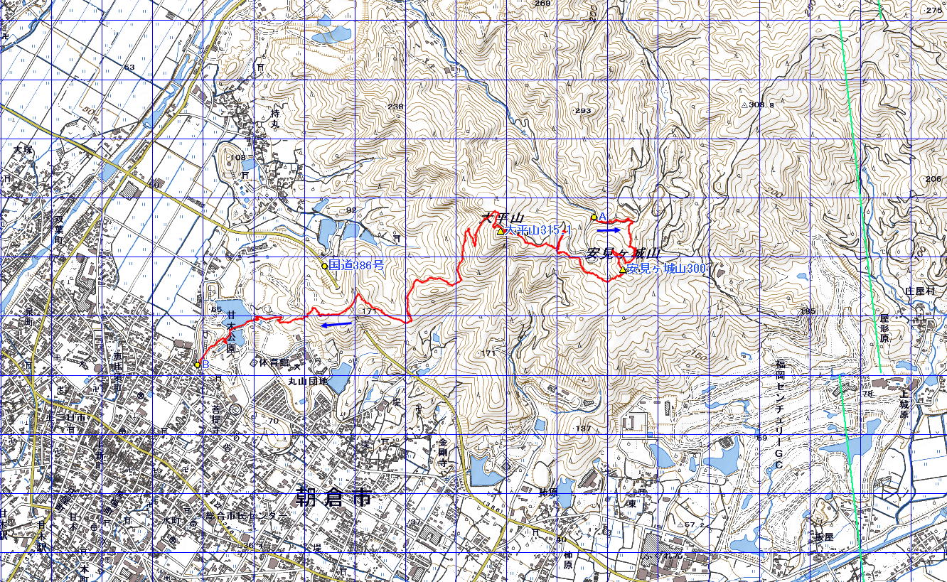 安見ヶ城山 大平山 (福岡県 16・12・31) 経路概念図 GPS軌跡 1/25000地形図 緯線の間隔10秒、距離約310m 経線の間隔10秒、距離約250m 3D 設定:対地高度840m レンズ16mm 図上段の数値は方位角(真北0°~360°)+日本山名データ25000+追加地名 経路断面概念図 GPSデータ+10mメッシュ標高データ 断面の沿面距離約5.0km 所要時間3:00