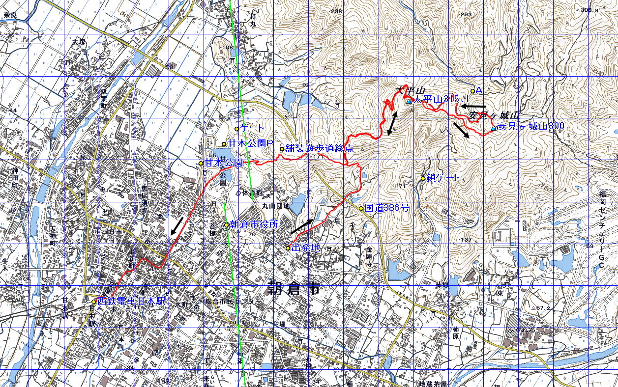 大平山 安見ヶ城山 (福岡県 20.3.6) 経路概念図 GPS軌跡 1/25000地形図 緯線の間隔10秒、距離約310m 経線の間隔10秒、距離約250m 緑の線は磁北線 注:出発地は堤集落、終着地は西鉄甘木駅 3D 設定:対地高度740m レンズ16mm 日本山名データ25000+追加地名 経路断面概念図 GPSデータ+10mメッシュ標高データ 断面の沿面距離約8.3km 所要時間2:50