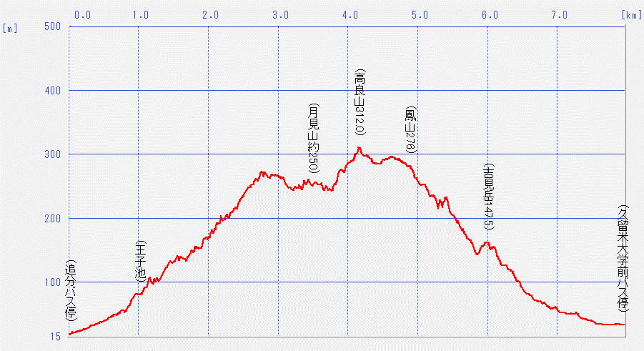 月見山(約250m)~髙良山(312.0m)~鳳山 おおとりやま(267m)~吉見岳(147.5m) 福岡県 |