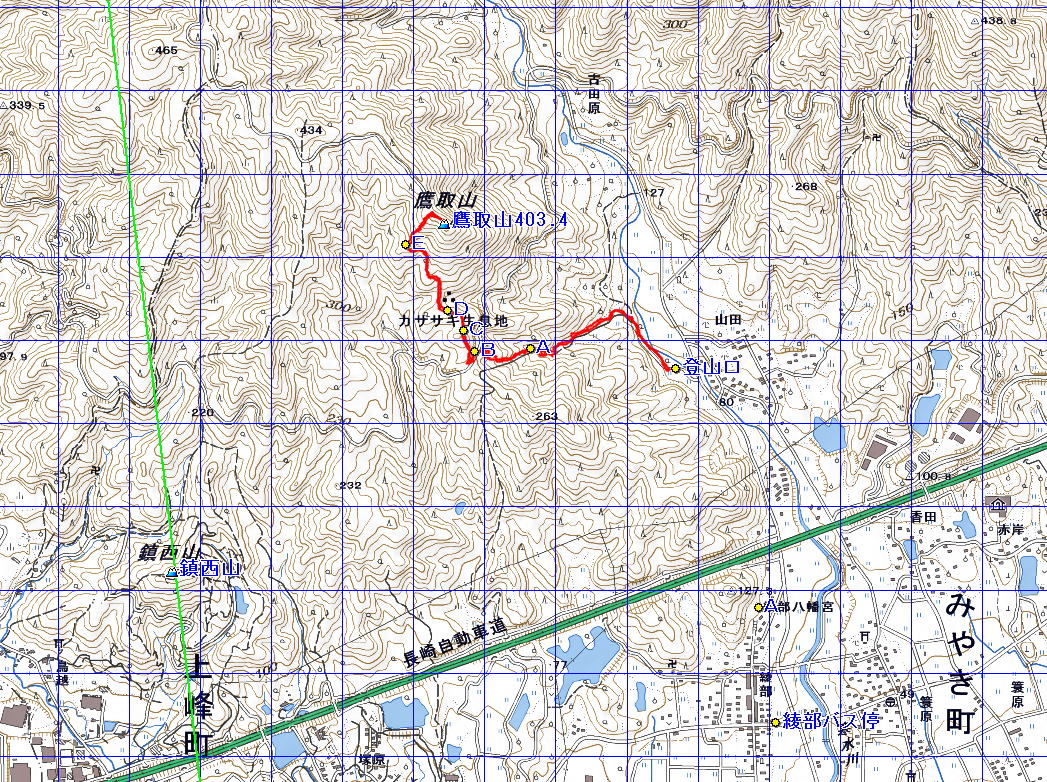 | 凡例 A:作業道終点・登山道取り付き B:林道出会い・左へ30mほど進んだところから右へ分岐する登山道へ C~Eまでは概ね自然林・人工林も現れる D:曲輪 E:ここから山頂までは自然林 |