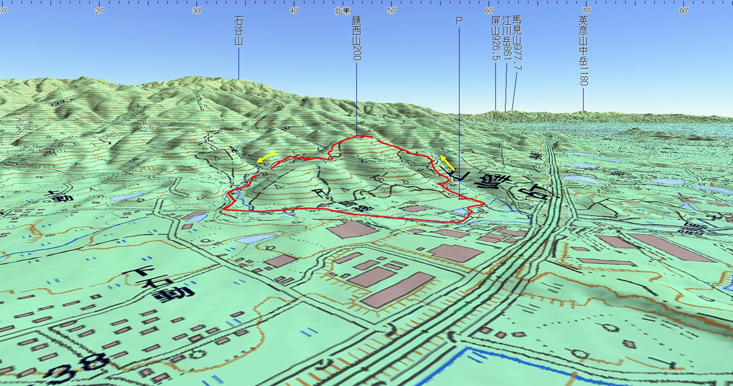 3D 設定:対地高度230m レンズ16mm 日本山名データ25000+追加地名 経路断面概念図 GPSデータ+10mメッシュ標高データ 断面の沿面距離約3.1km 所要時間1:25