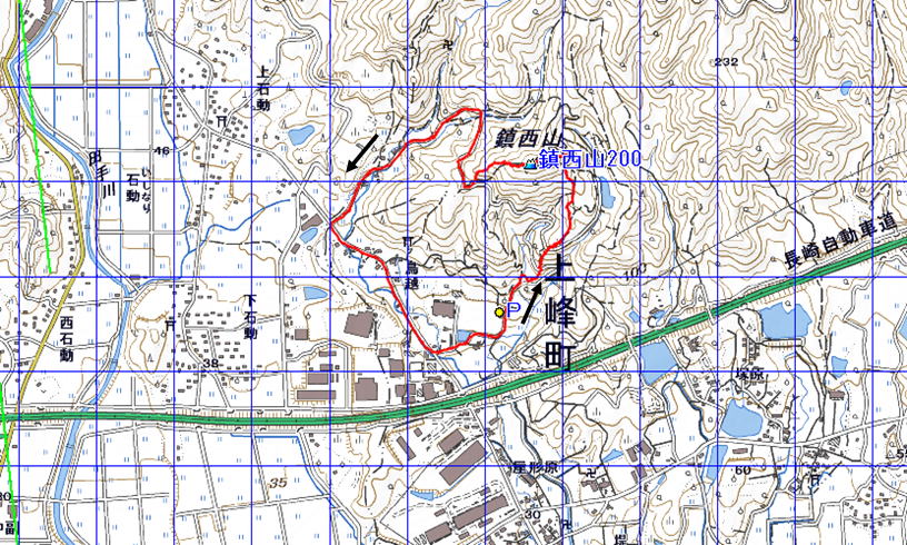鎮西山 (佐賀県 2021.12.12) 経路概念図 GPS軌跡 1/25000地形図 緯線の間隔10秒、距離約310m 経線の間隔10秒、距離約250m 緑の直線は磁北線 出発終着地はP(駐車場)