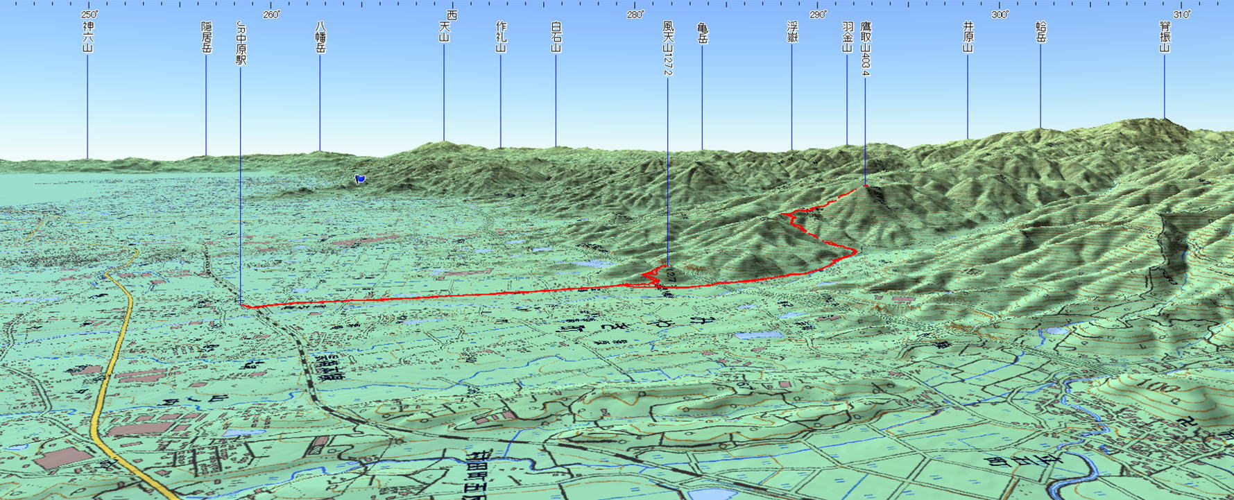 鷹取山 風天山(佐賀県 22.04.05) 経路概念図 GPS軌跡 1/25000地形図 緯線の間隔10秒、距離約310m 経線の間隔10秒、距離約250m 緑の直線は磁北線 注:出発終着地はJR中原駅 3D 設定:対地高度570m レンズ16mm 日本山名データ25000+追加地名 経路断面概念図 GPSデータ+10mメッシュ標高データ 断面の沿面距離約10.3km 所要時間4:50(うち昼食0:30)