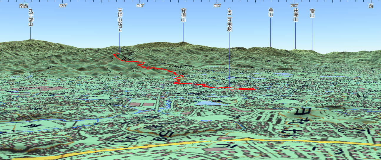 3D 設定:対地高度430m レンズ16mm 日本山名データ25000+追加地名 経路断面概念図 GPSデータ+10mメッシュ標高データ 断面の沿面距離約6.4km 所要時間2:10