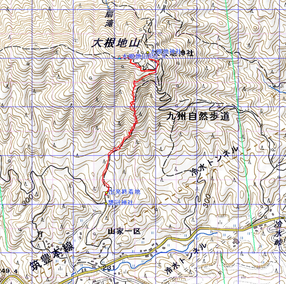 大根地山 (福岡県 22.07.13) 経路概念図 GPS軌跡 1/12000地形図 緯線の間隔10秒、距離約310m 経線の間隔10秒、距離約250m 緑の直線は磁北線