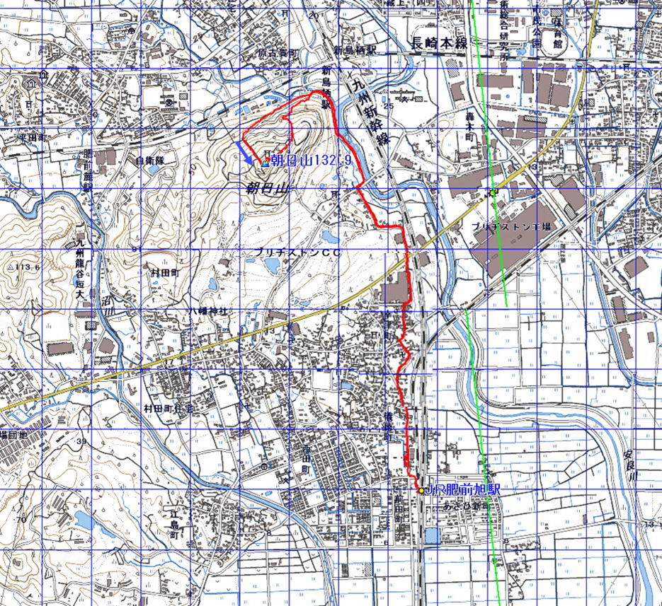 朝日山 (佐賀県 2022.9.9) 経路概念図 GPS軌跡 1/25000地形図 緯線の間隔10秒、距離約310m 経線の間隔10秒、距離約250m 緑の直線は磁北線 注:出発終着地は、JR肥前旭駅