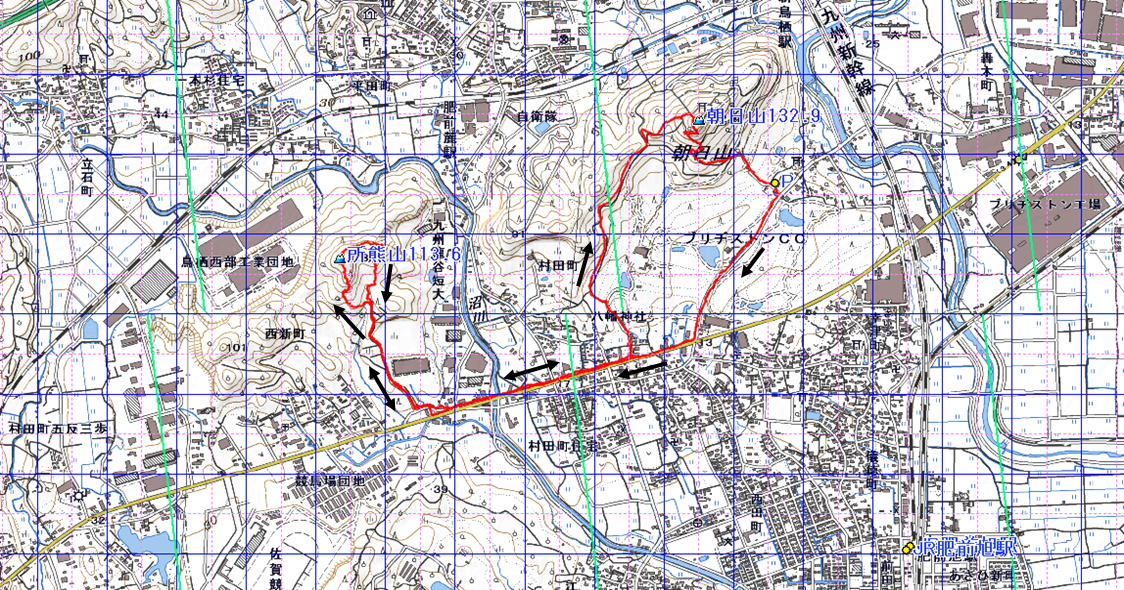 所熊山 朝日山 佐賀県 23.07.30) 経路概念図 GPS軌跡 1/12000地形図 緯線の間隔10秒、距離約310m 経線の間隔10秒、距離約250m 緑の直線は磁北線 注:出発終着地はP
