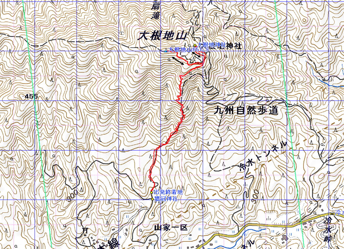 大根地山 (福岡県 23.10.01) 経路概念図 GPS軌跡 1/12000地形図 緯線の間隔10秒、距離約310m 経線の間隔10秒、距離約250m 緑の直線は磁北線