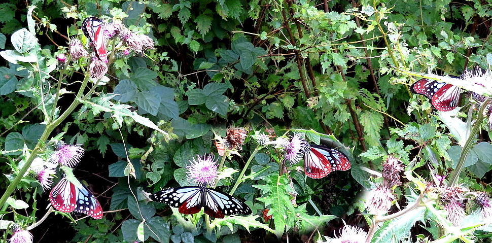 2023年10月4日 十月になって急に秋らしくなり、花の山といわれる天山を訪ねてみた。 広い草はらはススキの穂が光り、その綿毛は風に吹かれて飛び立っていく。 咲き始めているのは、アケボノソウやナワシログミの花。そして、たくさん咲いているのはアキチョウジやトリカブト、それにセンブリなどであった。さらに、この秋に初めてみるウメバチソウの花も数輪。^^♪ 今回出会った花は18種と多く、天山の花は霜が降りるころまで楽しめそうだ。 今日は嬉しい出会いも。それは、風の当たらない狭いところに群れて、花の蜜を吸うたくさんのアサギマダラ。この美しいチョウは蜜で栄養を補給しながら、吹き始めた北風に乗って海を渡り、遙かな越冬地への旅の途中であろう。 |