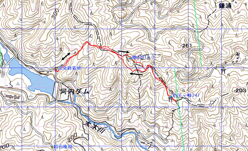 奥山 杓子ヶ峰(佐賀県 23.11.19) 経路概念図 GPS軌跡 1/12000地形図 緯線の間隔10秒、距離約310m 経線の間隔10秒、距離約250m 緑の直線は磁北線