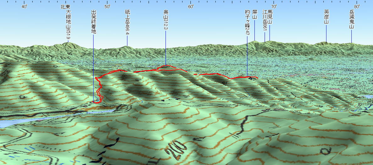 3D 設定:対地高度220m レンズ16mm 日本山名データ25000+追加地名 経路断面概念図 GPSデータ+10mメッシュ標高データ 断面の沿面距離約2.8km 所要時間2:00