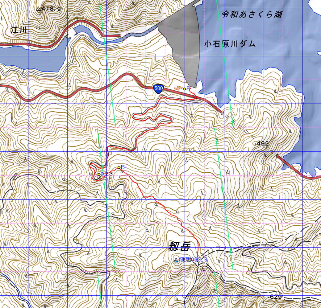 経路概念図 GPS軌跡 緯線の間隔10秒、距離約310m 経線の間隔10秒、距離約250m 緑の直線は磁北線