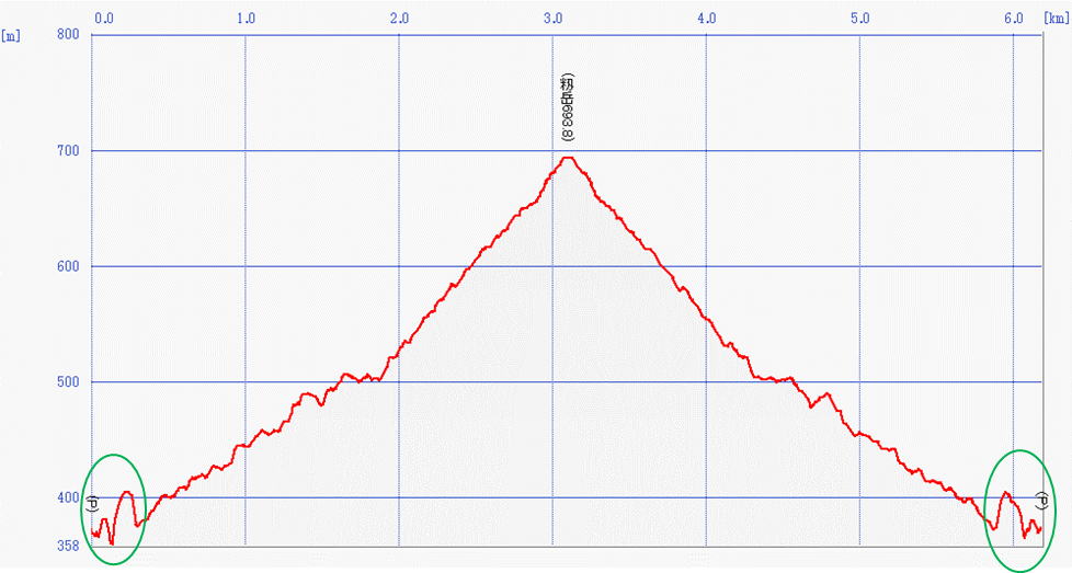 経路断面概念図 GPSデータ+10mメッシュ標高データ 断面の沿面距離約6.3km 所要時間2:40