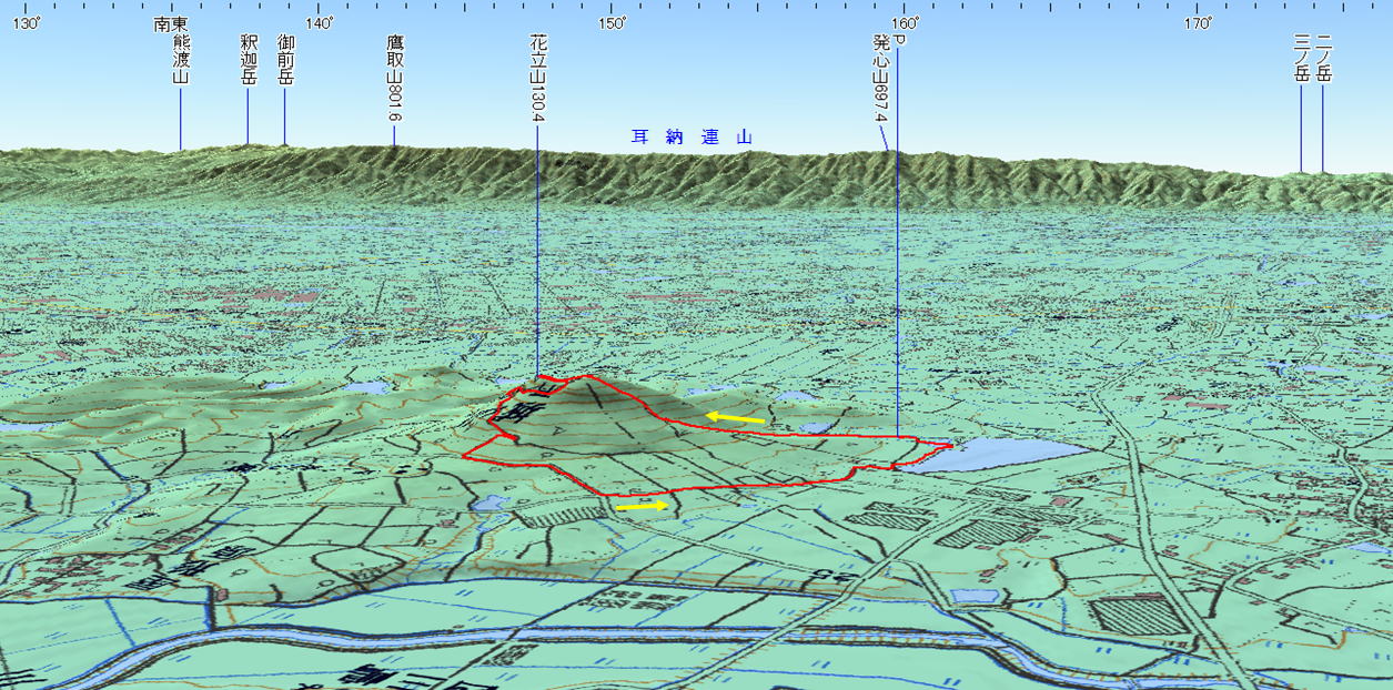 花立山 福岡県 24.0.3.02) 経路概念図 GPS軌跡 1/12000地形図 緯線の間隔10秒、距離約310m 経線の間隔10秒、距離約250m 緑の直線は磁北線 3D 設定:対地高度430m レンズ16mm 日本山名データ25000+追加地名 経路断面概念図 GPSデータ(軌跡+標高)断面の沿面距離約2.6km 所要時間1:00