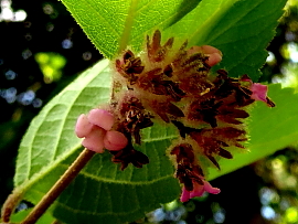 | 2024年6月5日 朝倉市の甘木公園から旧道を通り、大平山から安見ヶ城へ周回した。 旧道の最初のピークには、新たに「171m峰」の標識がつけられている。ここは地図に標高点が記載されているところで、いつも通っていた。そこに標識がつけられたことで、今日は1座増えて3座に登った気分だ。^^ ルートには草花が少なくなり、クリやムラサキシキブ、それにネジキなどの木に咲く花が見頃になっている。そして、暦の上では夏になり、山の緑も一層濃くなってきた。 |