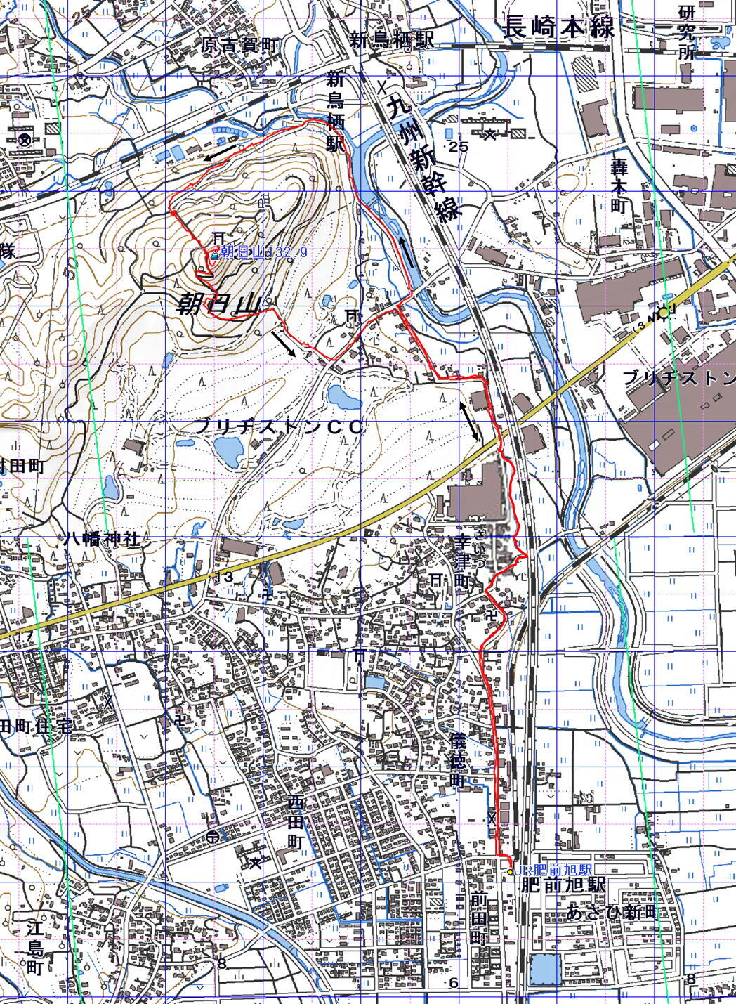 朝日山 佐賀県 24.06.12) 経路概念図 GPS軌跡 1/12000地形図 緯線の間隔10秒、距離約310m 経線の間隔10秒、距離約250m 緑の直線は磁北線 注:出発終着地は、JR肥前旭駅