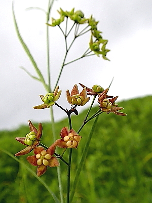 2024年7月8日 この山を訪れるのは、三週間ぶりである。目当てはスズサイコの花。 実は、前回もスズサイコの様子を見に来た。しかし、その時は葉っぱだけで、つぼみも出ていなかった。 それが今日は期待通りに花が咲き始めており、つぼみもあちらこちらに見える。この花は目立つ存在ではないものの、緑の草原に立つその姿になぜか惹かれる。 今日新たに咲いていたのは、カワラナデシコやシオデ、それにアキノタムラソウなどの花であった。 |