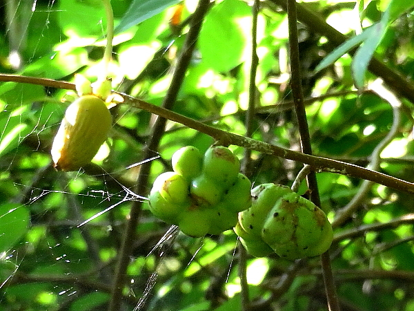 マタタビの実 左は正常な果実 右の二つは虫えい果(虫こぶ) |