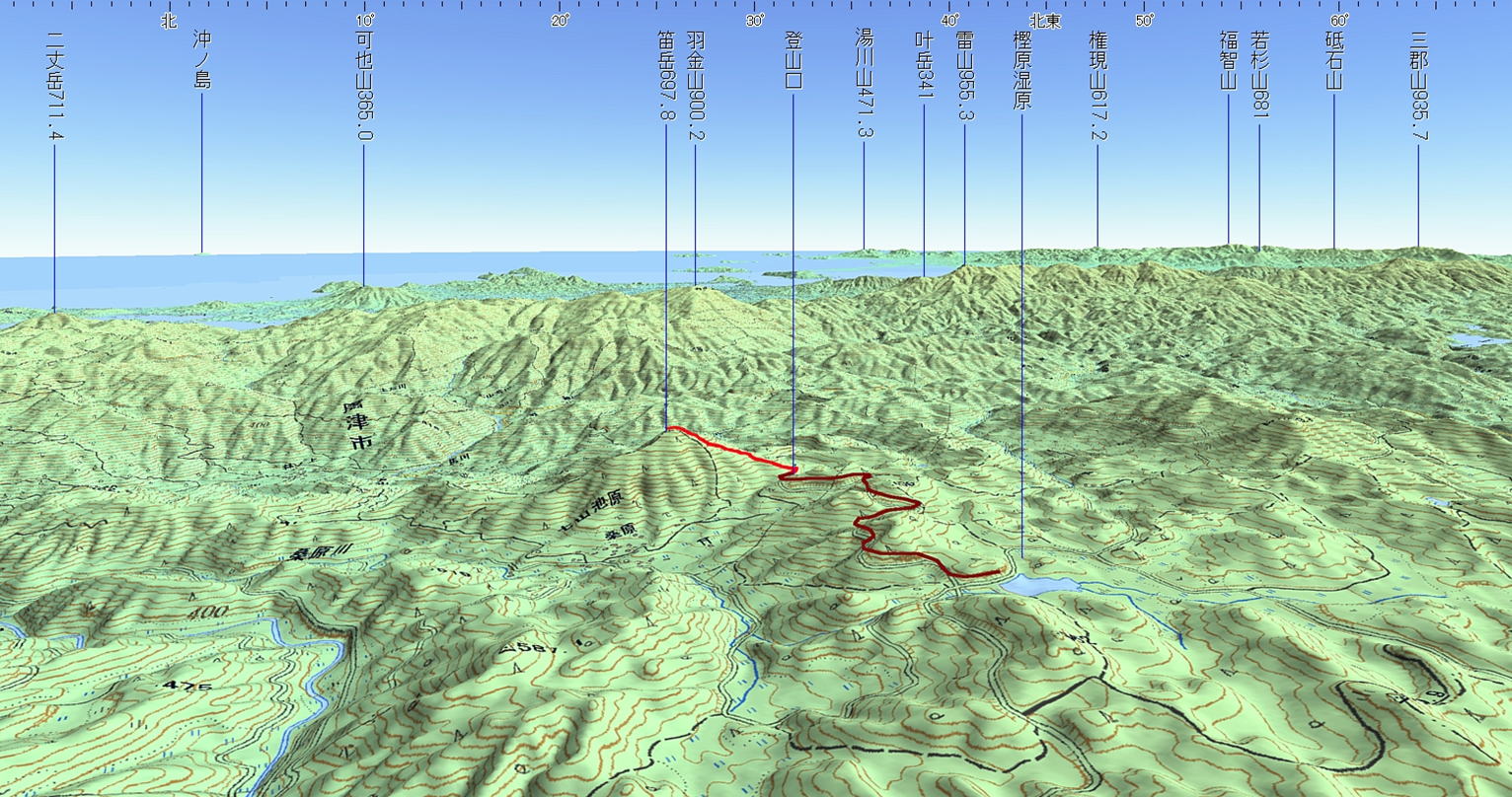 笛岳 (佐賀県 2024.9.2) 経路概念図 GPS軌跡 1/25000地形図 緯線の間隔10秒、距離約310m 経線の間隔10秒、距離約250m 緑の直線は磁北線 注:茶色の軌跡は、登山口へ通じる林道 3D 設定:対地高度830m レンズ16mm 日本山名データ25000+追加地名 経路断面概念図 GPSデータ+10mメッシュ標高データ 断面の沿面距離約1.3km 所要時間0:50