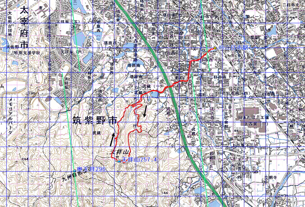 天拝山(福岡県 24.09.09) 経路概念図 GPS軌跡 1/25000地形図 緯線の間隔10秒、距離約310m 経線の間隔10秒、距離約250m 緑の直線は磁北線