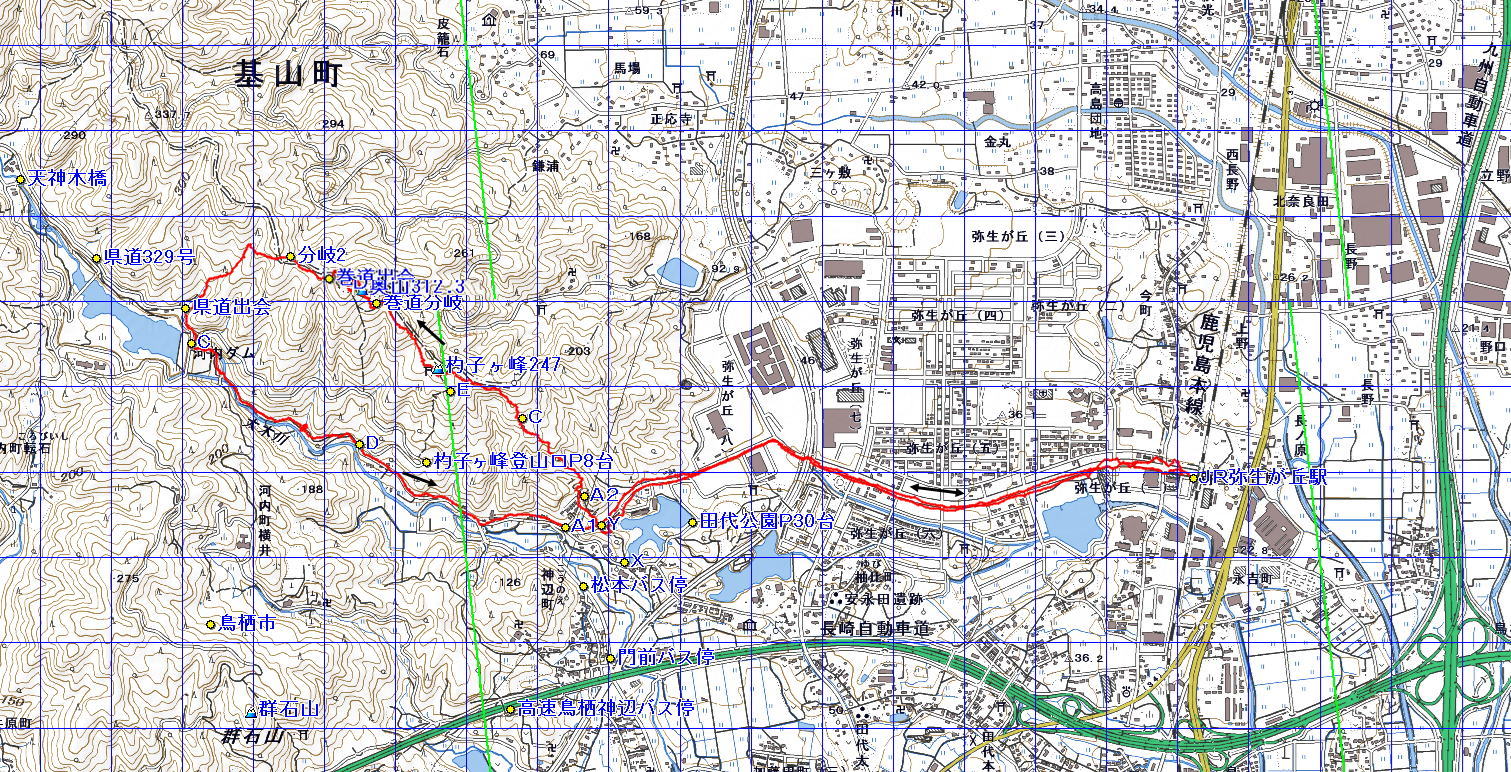 奥山 杓子ヶ峰 (佐賀県 2024.9.27) 経路概念図 GPS軌跡 1/25000地形図 緯線の間隔10秒、距離約310m 経線の間隔10秒、距離約250m 緑の線は磁北線 注:出発終着地は、JR弥生が丘駅