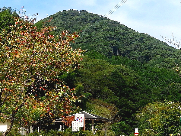 山田水辺公園から見る鷹取山 手前のサクラは色づき始めている |