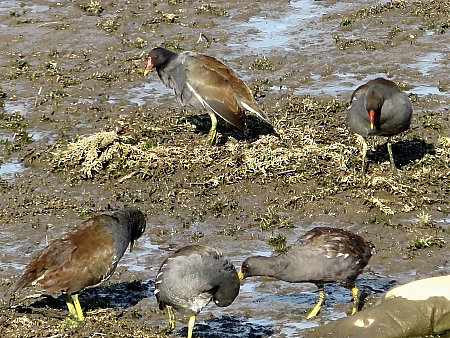 クロツラヘラサギ(白くて大きい3羽)・カルガモ |