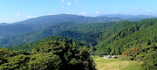 基山山頂からの眺め 中央奥は九千部山 右奥は脊振山 右下は草スキー場 |