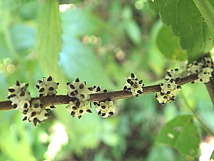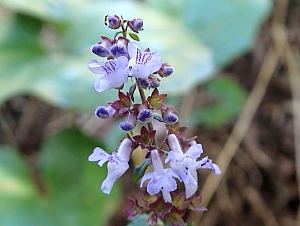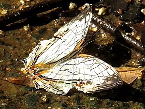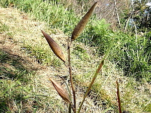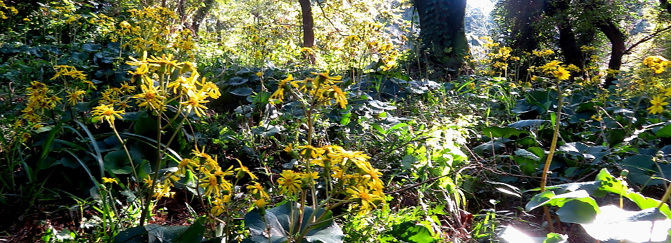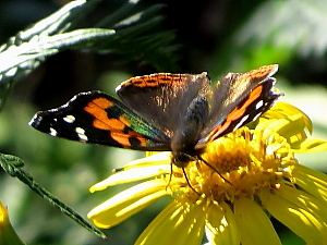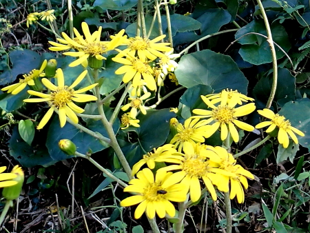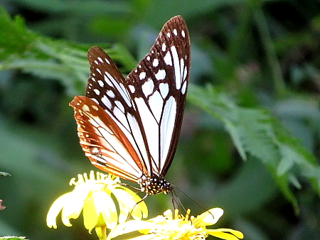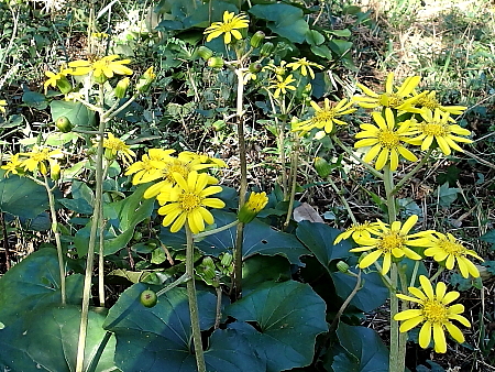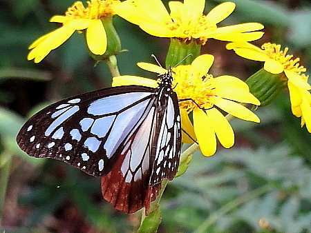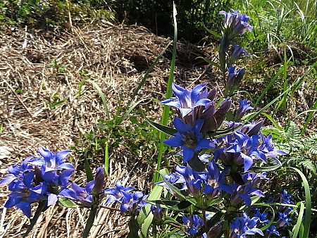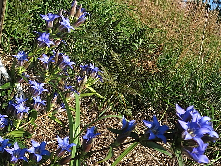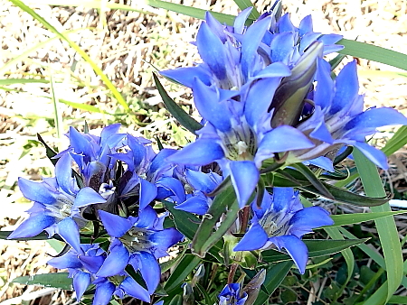 2024年11月4日 十日ぶりに奥山から杓子ヶ峰へ歩いてみた。咲いている花の種類は前回とほぼ同じであるが、花の数はずいぶんと多くなっている。 中でもリンドウは満開で、一株一株がブルーの盛り花のように咲いていた。黄色いツワブキの花も満開に近く、登山道沿いの斜面にたくさん咲き誇っている。 今日も気温が高く、途中では色々なチョウに出会う。ひときわ目立つのは、淡い藍色が美しいアサギマダラ。この大きなチョウは南へ渡る途中のようで、ツワブキの花から花へと飛び回っては、その蜜を盛んに吸っていた。 |
