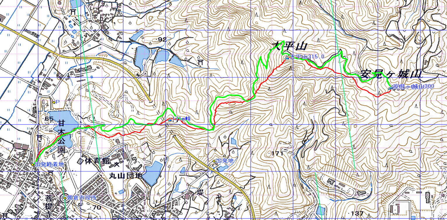 大平山 安見ヶ城山 (福岡県 24.11.19) 経路概念図 GPS軌跡 1/12000地形図 緯線の間隔10秒、距離約310m 経線の間隔10秒、距離約250m 緑の直線は磁北線